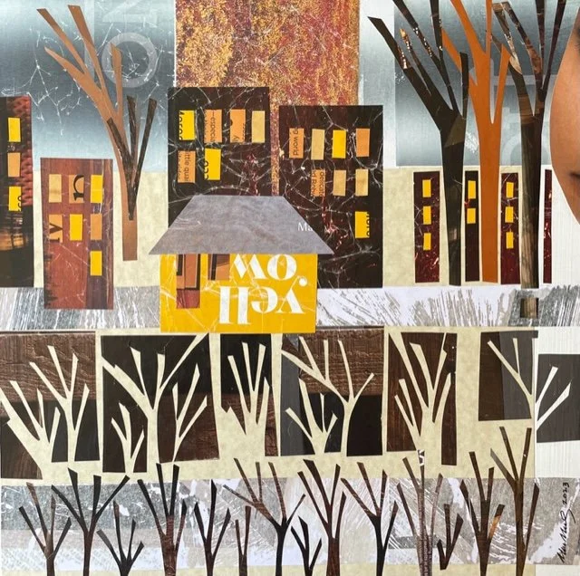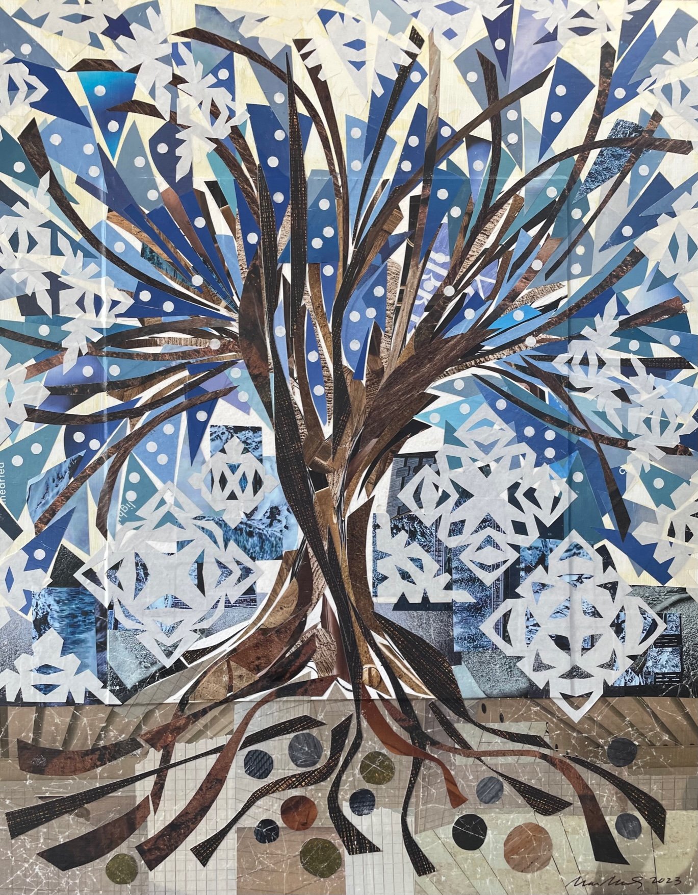 Cement Tree Snow 20x16 in. Collage on wood panel 2023 SOLD