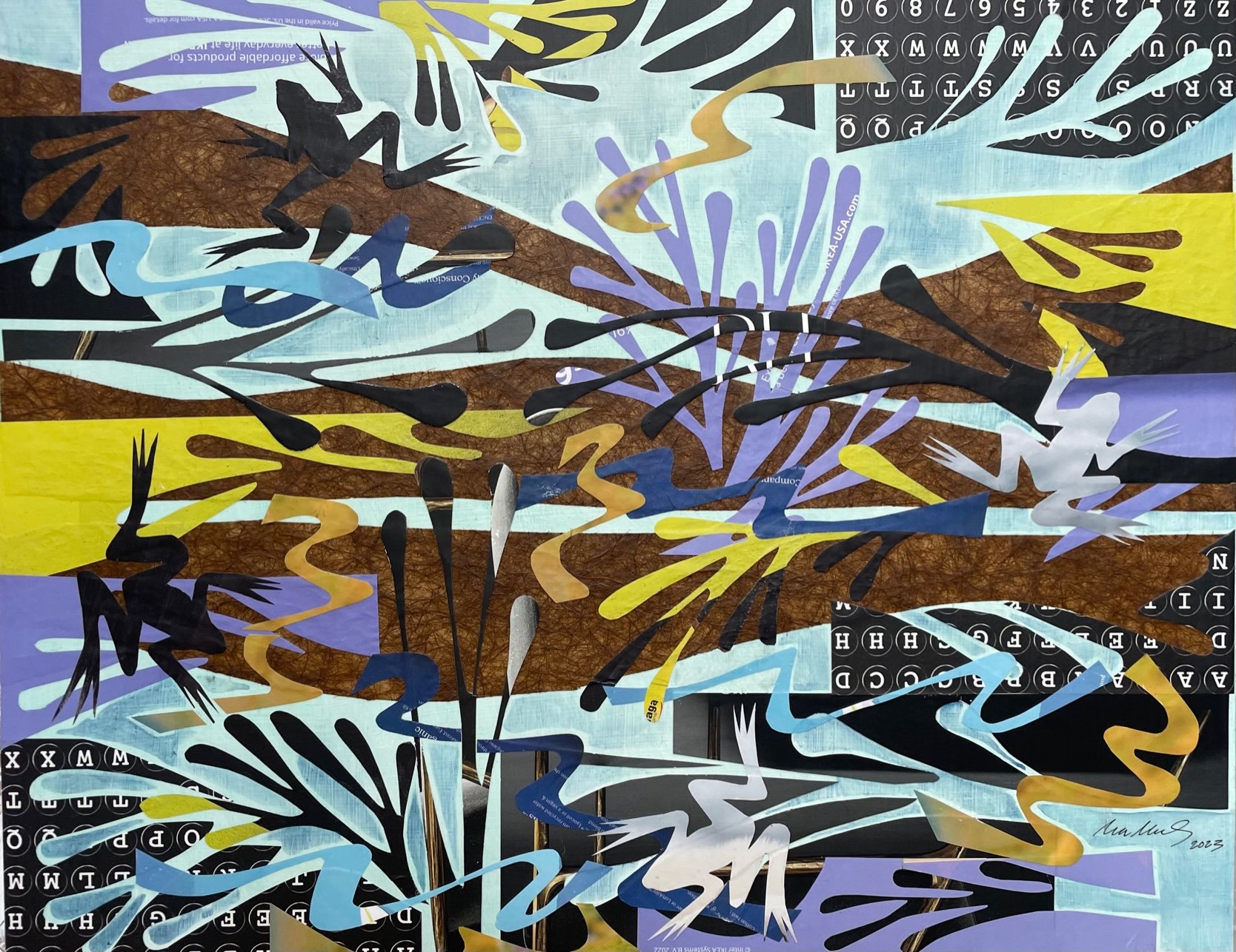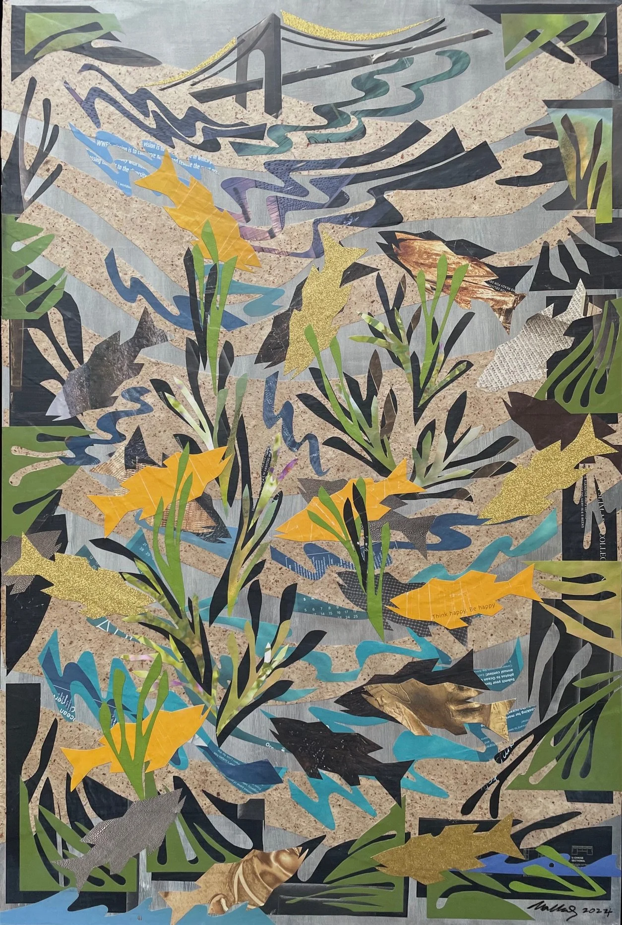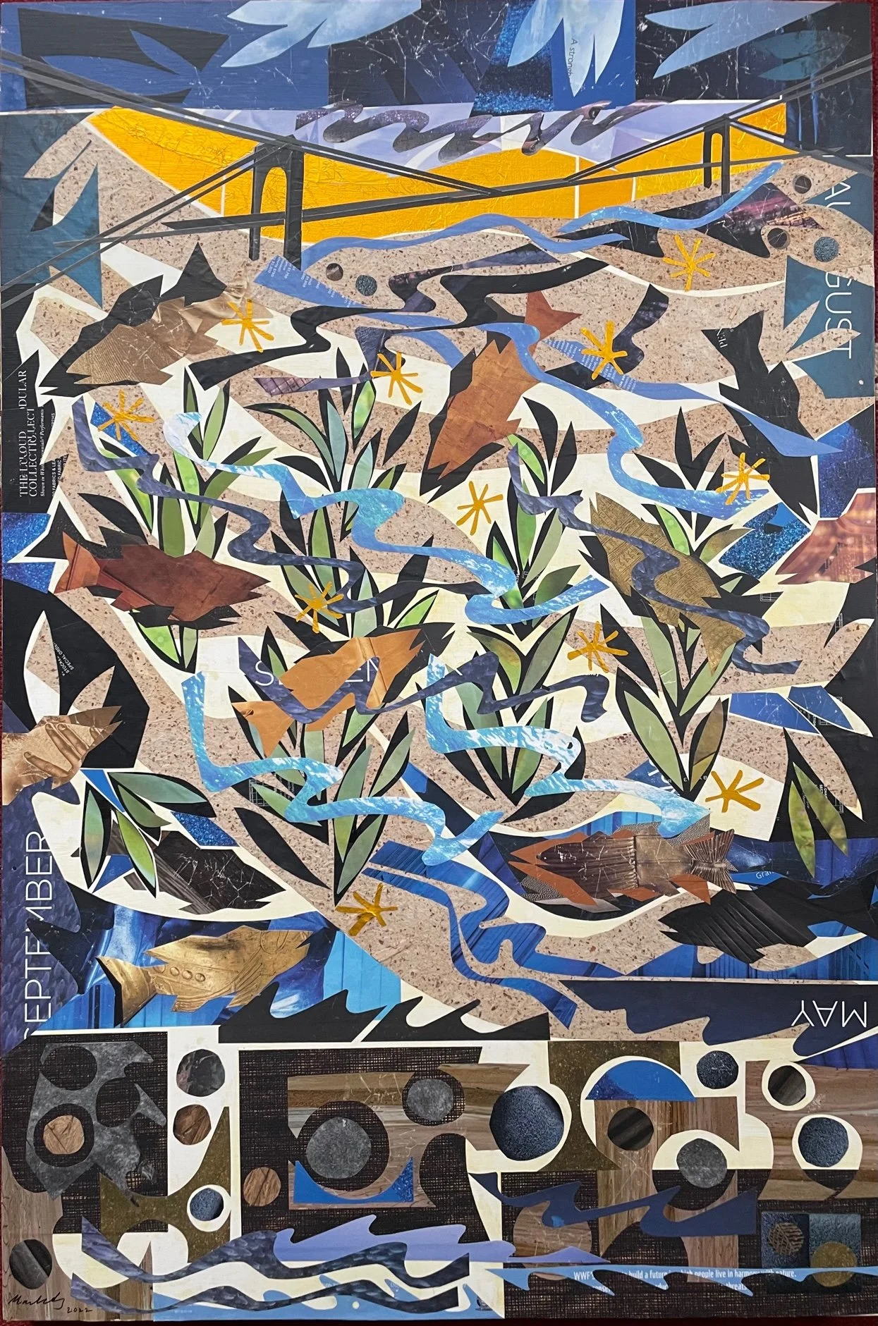 Schooled Down River 36x24 in. Collage on wood panel 2024